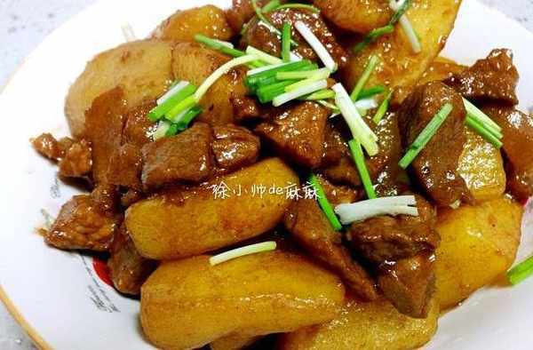 4、湯汁還剩一半的時候將土豆塊放進去翻炒,繼續燜煮3-5分鐘,直到湯汁差不多沒有瞭,大火收汁即可。裝碗撒上香蔥。