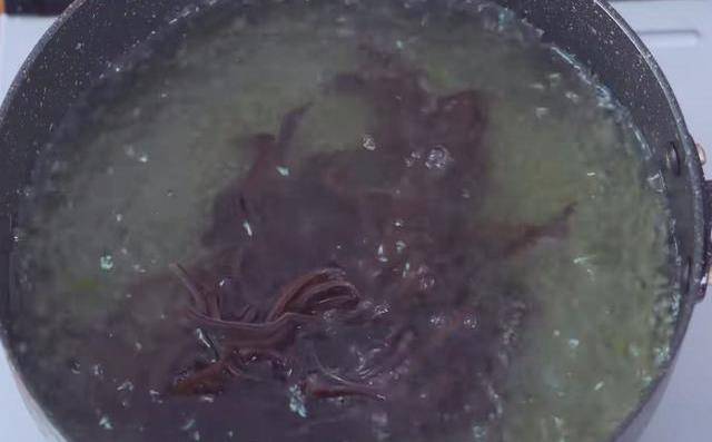 第四步:之後把黑木耳絲倒入煮菠菜的水中,焯水三分半鐘撈出控幹。