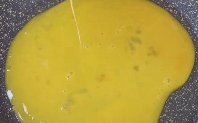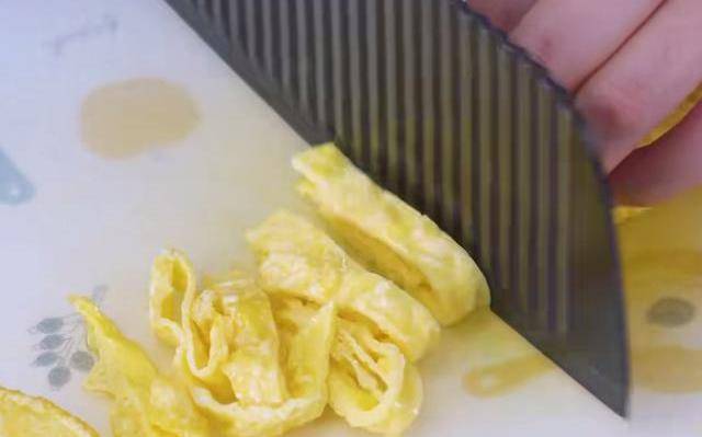 第二步:把準備好的雞蛋液倒入三成油溫的油鍋中,全程中小火煎制,左右搖晃,讓雞蛋液形成一塊直徑不低於15cm的雞蛋餅,煎至正反兩面凝固之後,取出鋪在砧板上,適當放溫後,切成雞蛋條備用。
