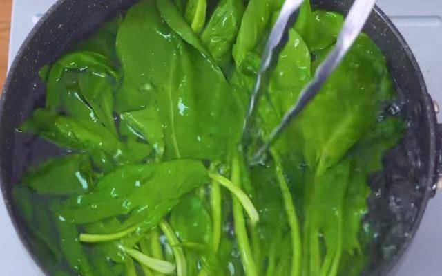 第三步:鍋中準備300ml的沸水,加入少許的食用鹽和食用油,稍微攪拌幾下,把菠菜放入其中,大火水煮兩分鐘左右迅速撈出,過一下涼白開控幹備用。