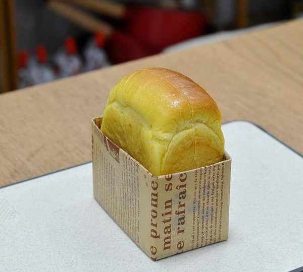 第2步、南瓜吐司一切兩半,底部不要切斷,放在三明治盒中。