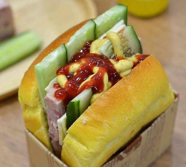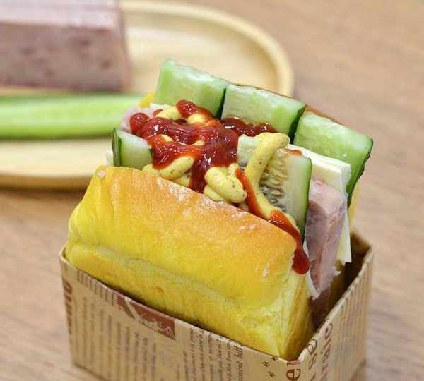 原料:南瓜吐司、午餐肉、芝士、黃瓜、美式芥末醬、番茄沙司。