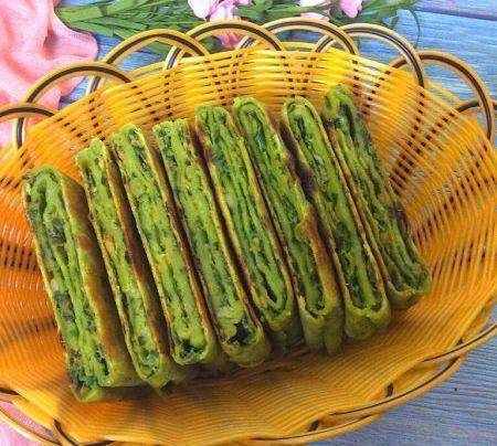 蝦肉韭菜餡燙面菠菜面千層餅