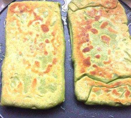 放上餅,烙制底面金黃色,翻面