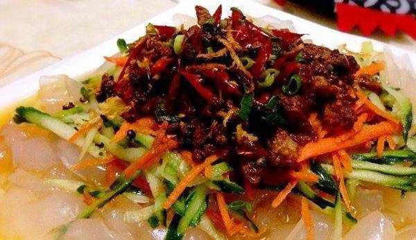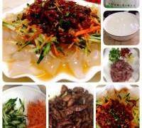 醬個肉絲用油把肉絲炒熟(大火爆炒)用醬油上色,在拉皮上均勻的灑些鹽入味,然後把這些材料依次擺上,最後練油來瞭油潑,最後拌勻,完成美美的開吃吧!