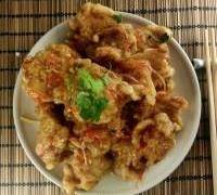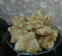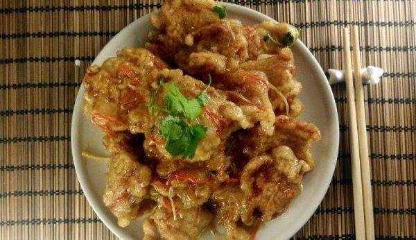 6. 待油溫升到七成的時候,把分批炸好的肉一次性放入鍋中炸。過程中,炸兩遍,每次炸的時間不要超過一分鐘,時間長瞭會導致硬而不酥。炸至外殼酥脆,呈金黃色即可。