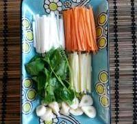 2. 胡蘿卜、大蔥、薑切細絲。蒜切片,香菜切段。