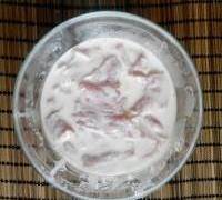 3. 淀粉中加入水,侵泡十分鐘,倒出多餘的水攪成糊狀,大概是半化的冰淇淋狀,倒入裡脊肉,用手抓勻至沒一片肉都均勻裹上淀粉。