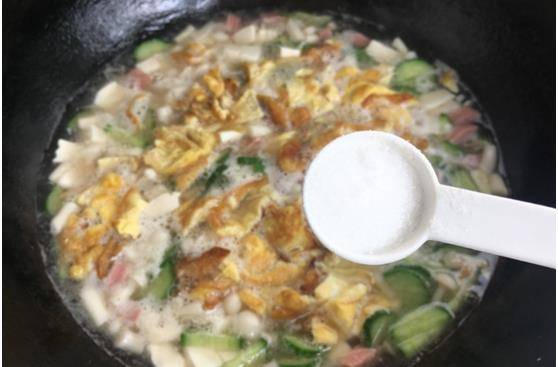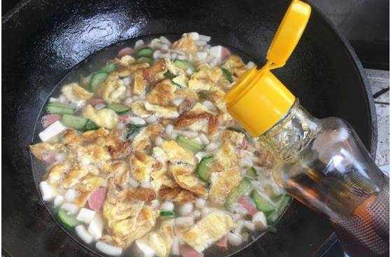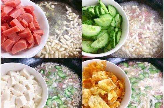 第八步:接著依次放入火腿腸,黃瓜片,豆腐丁和雞蛋碎,攪拌均勻。