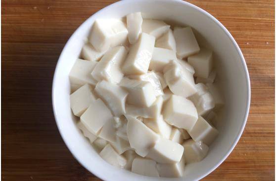 第三步:將內酯豆腐從盒中取出,倒扣在案板上,切成小丁。