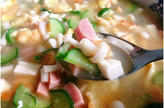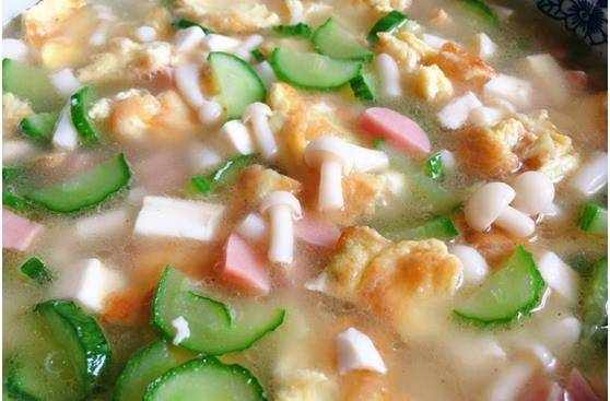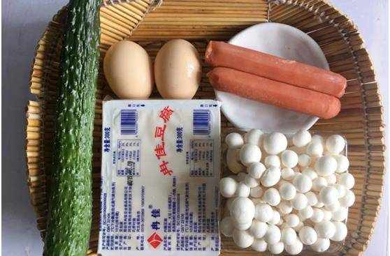食材:雞蛋2個,黃瓜1根,內酯豆腐1塊,白玉菇1盒,火腿腸2根,生薑1小塊。