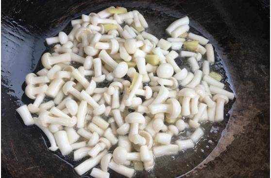 第七步:倒入白玉菇翻炒出水分。