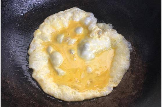 第五步:鍋中倒瑞適量油,將打好的蛋液倒入鍋中,炒制成熟後取出。