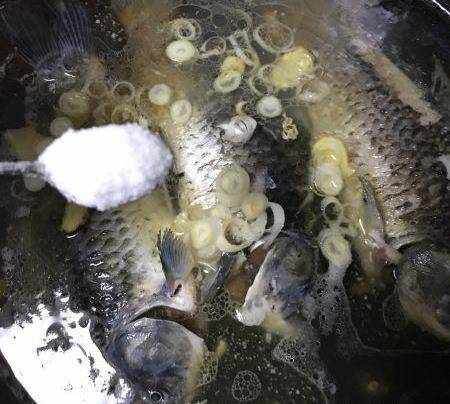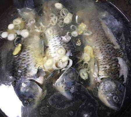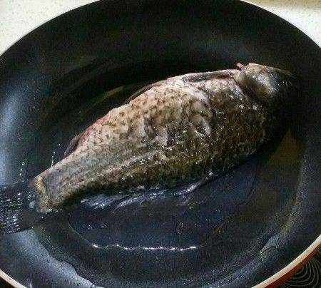熱油,鯽魚下鍋煎。