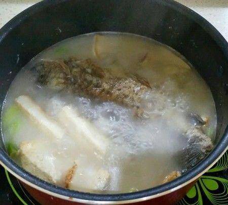 油開放入鯽魚兩面稍微煎一下(不要煎太久,以免魚皮煎掉)?倒入涼水,莫過魚身即可