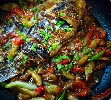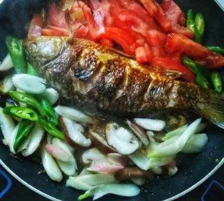下香菇、番茄和剩下的青椒至油鍋中,不時小心翻炒,以免破壞鯽魚的完整度;