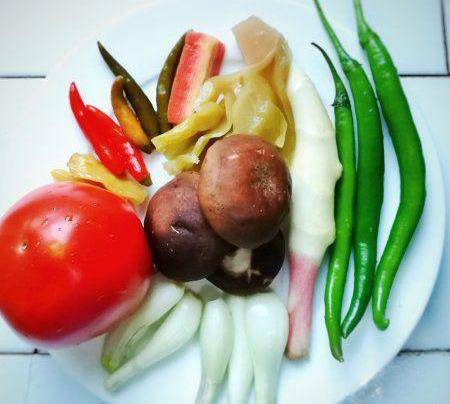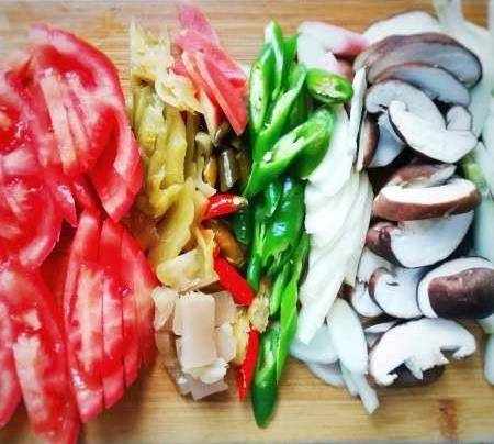 洗凈蔬菜(自己或傢人喜歡的時令蔬菜);(泡椒、泡胡蘿卜、酸菜、青椒、仔薑、香菇、番茄、茭頭)