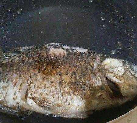 鯽魚及時翻面,以免粘鍋,註意隨即翻炒香料;(若覺忙不過來,可以先盛起香料)