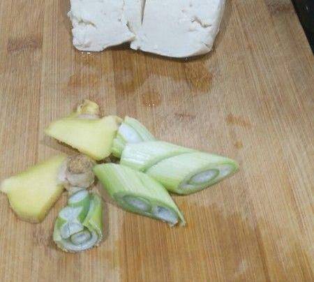 豆腐盛出放入湯鍋裡,把蔥薑也一起放進去。