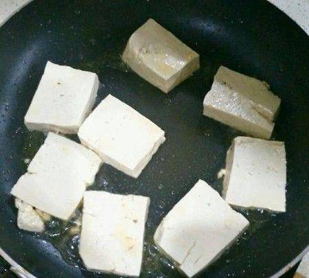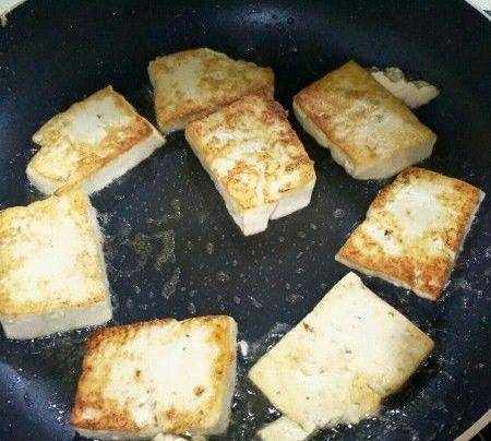 豆腐切厚片,用剛剛煎魚的油煎。