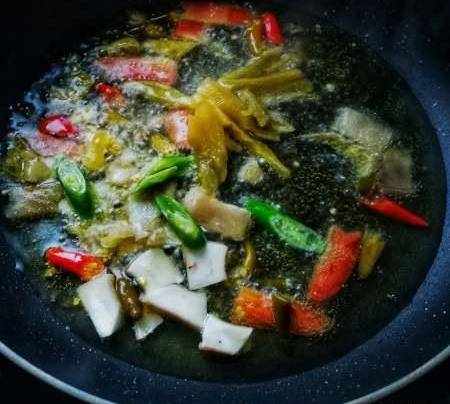 熱鍋下植物油,油7成熟時下泡椒、酸菜、部分青椒(前取一半青椒味增香、後取一半青椒貌增色)、香菇柄第炒香;