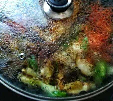 待時蔬微潤稍曲以後,加鍋蓋燜兩分鐘;(若之前少油,此時可加少許開水)