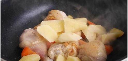 接下來,我們選擇將準備好的胡蘿卜倒入鍋中,進行炒制,過瞭一段時間後,將步驟1中準備好的雞腿倒入其中,進行煎制,在這裡煎制的時間不用太長。然後就可以放進準備好的土豆瞭。在此過程中,需要小心的是,在倒入食材時,因為食材表面可能含有水,在與熱油接觸的瞬間會使鍋中的油噴濺,因此建議大傢盡量站遠一些,以防被燙傷。