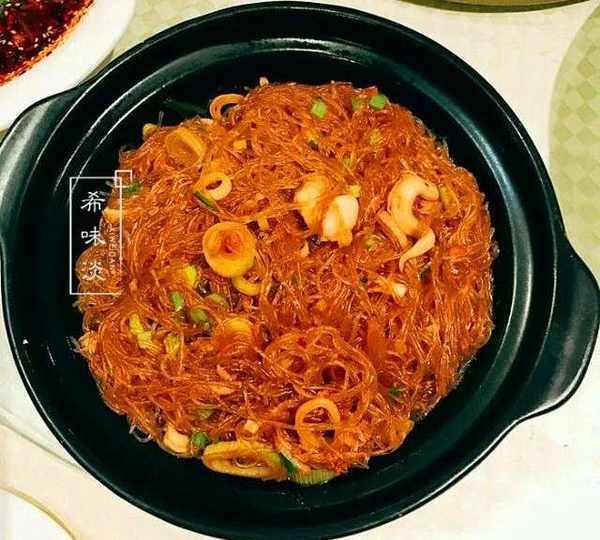 第二個菜:海鮮粉絲,這個菜接著上來的,我就嘀咕瞭,粗面瞭又是粉絲,裡面就三個蝦仁,還有蔥花,蒜片,腰果,有瞭粗面墊底瞭,粉絲大傢興趣不大瞭,都在期待其他菜
