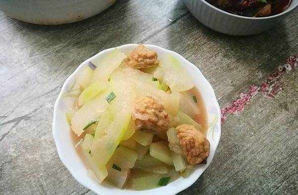 第三道肉丸燜冬瓜,還有三個肉丸,每個肉丸一切為二,加入冬瓜同燉。孩子一直喜歡吃冬瓜,而這時的冬瓜都已經成熟,非常甘甜粉糯,簡單的燜一燜就很美味,最後都吃完瞭。做法:肉丸炒一炒,加入冬瓜翻炒,加水燜至熟透,加鹽少許生抽調味即可。