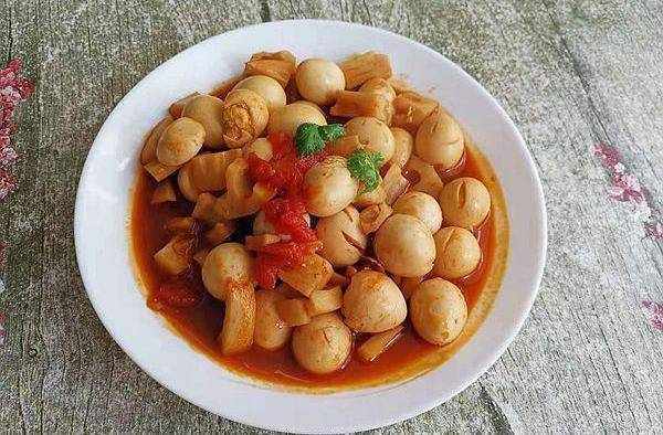 做法:蓮藕切丁,番茄切塊,鵪鶉蛋備好,鍋中入油,加入香蔥、番茄塊炒一炒,加入蓮藕丁、鵪鶉蛋,加入適量清水,番茄醬、生抽、精鹽,燒至四五分鐘即可出鍋。