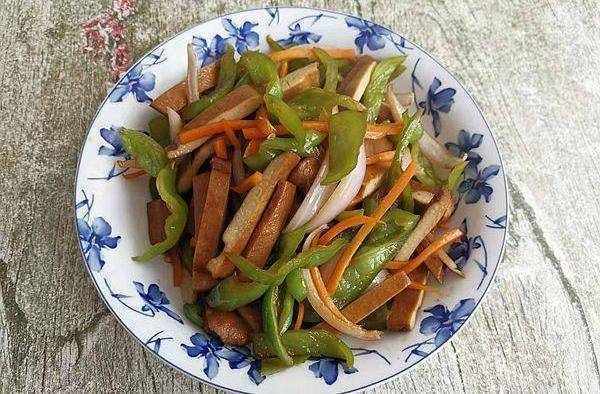 做法:準備好食材,鍋中入油,加入青椒、精鹽,炒一炒,加入香醋、糖、生抽炒勻,加入胡蘿卜絲、洋蔥絲炒勻,最後加入香幹,少許鹽炒一炒即可出鍋。