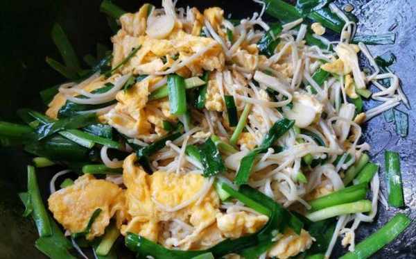 其次,另外起鍋炒金針菇和韭菜,記得炒出水分來,加上一些雞蛋塊,然後調味,記得不要添加雞精,雞精會讓原本的鮮味和香味丟失,味道反而差一些。