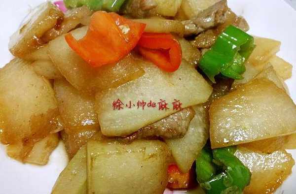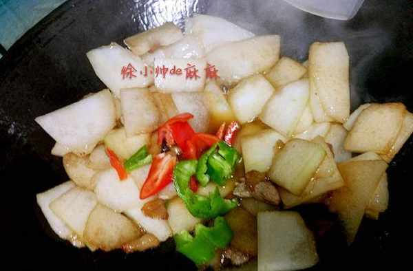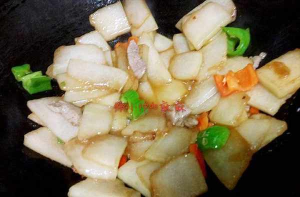 3、將青紅椒片也加進去翻炒均勻,加入一點開水,稍微燜煮1-2分鐘即可。