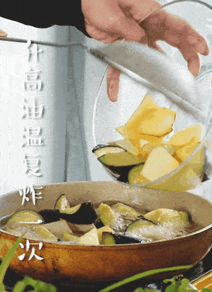 4.第四步,油溫不高時將茄子下入炒一下