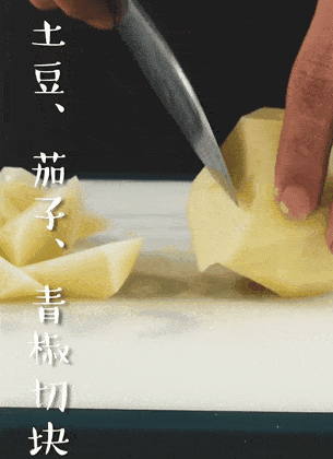 1.第一步,將土豆去皮其他食材洗幹凈,土豆、茄子、辣椒切滾刀塊