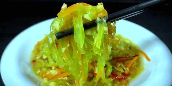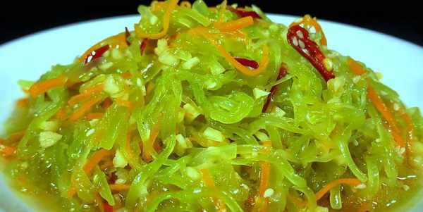 3.萵苣絲醃制好後,出很多水分,再用清水洗掉多餘的水分,洗凈後,擠幹水分裝入碗中,倒入調好的料子,用勺子攪拌均勻,就可以食用瞭。