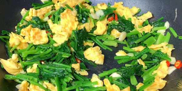 7.鍋內翻炒均勻後,就可以出鍋瞭,一道好吃又簡單的菠菜炒雞蛋就做好瞭,喜歡的點贊收藏試試吧!