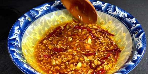 2.大蒜拍碎剁成蒜末,幹辣椒剪成細絲,將辣椒籽挑出,全部處理好後裝入碗中,再加入一勺白芝麻,淋入熱後,激發出香味,加入兩小勺的白醋、一勺生抽、少許的食鹽、少許的白糖、一點雞精、一勺蠔油,最後加入少許小磨香油,用勺子攪拌均勻備用。