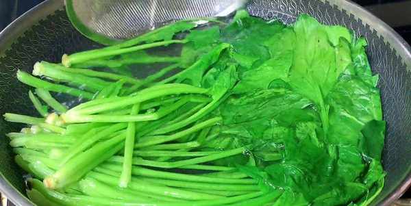3.鍋內倒入適量的水,水開後加入少許食鹽和食用油,再倒入菠菜,用勺子輕輕推動,使其受熱均勻,焯水30秒左右,撈出放入涼水中。