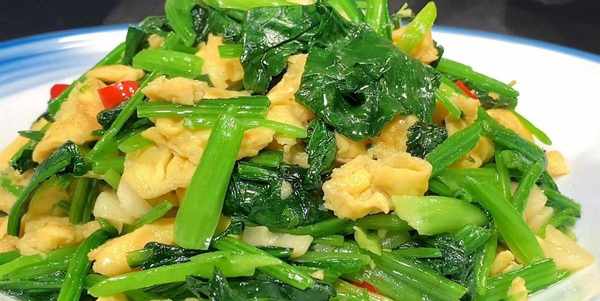 6.鍋內加入一勺豬油,豬油融化後,倒入大蒜和小米椒,炒出香味後,倒入菠菜和雞蛋,再加入一點食鹽、少許的雞精、半勺蠔油提鮮、大火快速翻炒,將鍋內調料炒至融化。