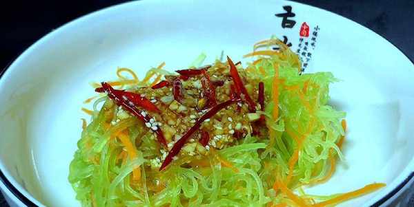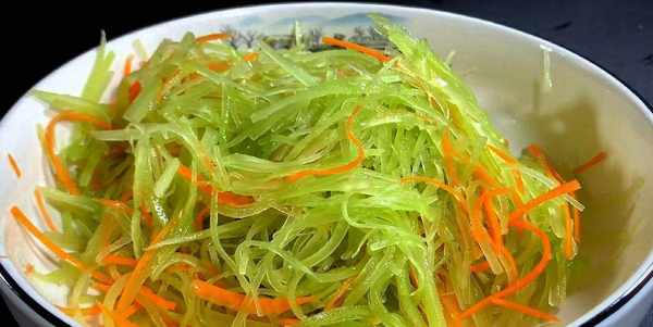 1.準備一根萵苣,削去外皮,放在案板上,改刀切成細絲,切好後裝入碗中,再加入胡蘿卜絲,一勺食鹽、一勺白糖,用手抓拌均勻,醃制5分鐘。
