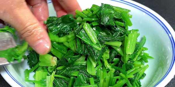 4.菠菜過涼後,擠幹水分放在案板上,把菠菜的根部切掉一點不要,再改刀切成小段,切好後裝入碗中備用。