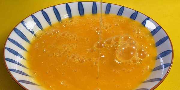 5.鍋內倒入少許食用油,油熱後倒入雞蛋液,中小火煎至定型,用鏟子劃成小塊,炒熟後盛出裝入碗中備用。