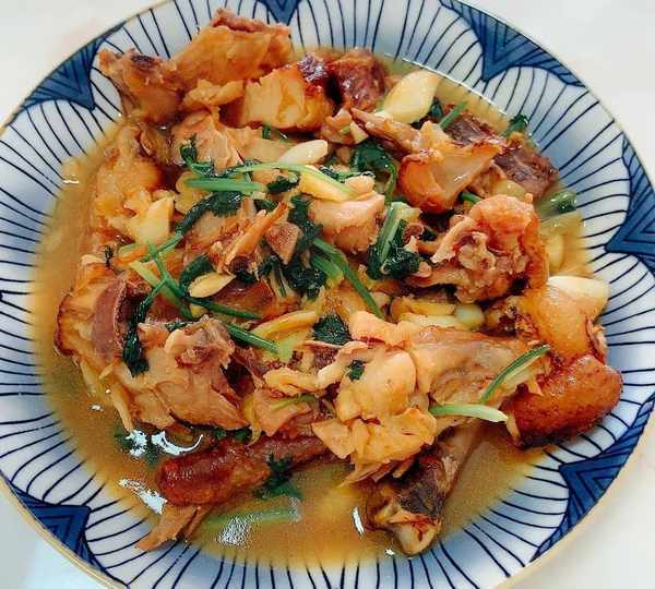 3.鍋熱倒入適量的油,先把蒜碎爆香後倒入臘雞塊大火翻炒片刻,再加少許生抽調味,然後倒入適量的開水燜2分鐘左右,出鍋前加香菜調味即成下飯又下酒的炒臘雞。