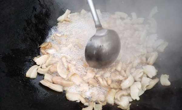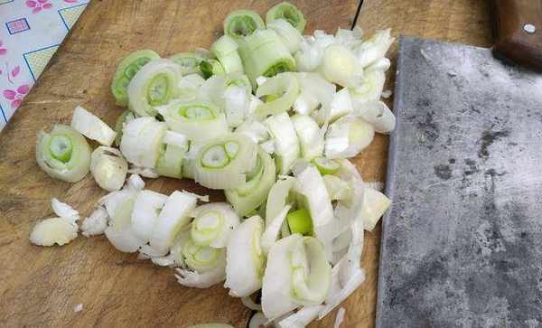 然後把切好的蔥段,薑塊,還有其它的一些調料一起放進鍋裡,熗鍋。