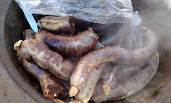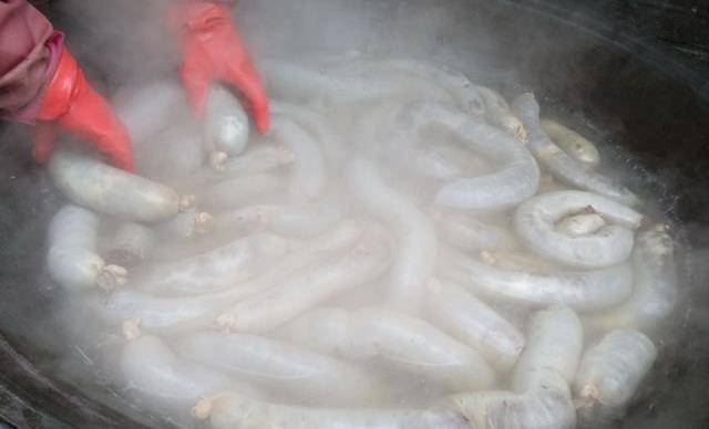 這個時候,另一口大鍋的豬血腸也出鍋瞭,放冷瞭變硬瞭後,切好瞭準備待用。