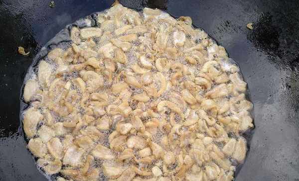 這個時候,豬板油已經煉到瞭焦黃色,把油渣撈出來,隻留下煉出來豬油。