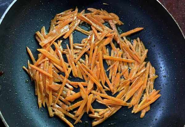 3.鍋裡面倒油,油燒熱,把油放在鍋中,把胡蘿卜放入鍋裡面。胡蘿卜絲下鍋後用小火炒,慢慢地炒,才不會將胡蘿卜炒焦。炒的過程中要多翻動,鍋裡面的胡蘿卜炒個20秒鐘之後,我們再把豆芽菜跟韭菜也放入;