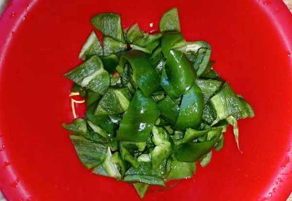 1.準備好的青椒放在盤中,裡面加入適量的食鹽水浸泡,將其表面沖洗幹凈,洗凈後放在案板上,用刀將其籽取出,然後再切成小塊,切好後放在盤中備用;