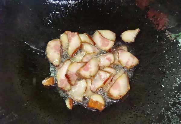 2.臘肉焯水後洗凈,然後切成細片。鍋中倒入臘肉片,小火炒出裡面的油脂;